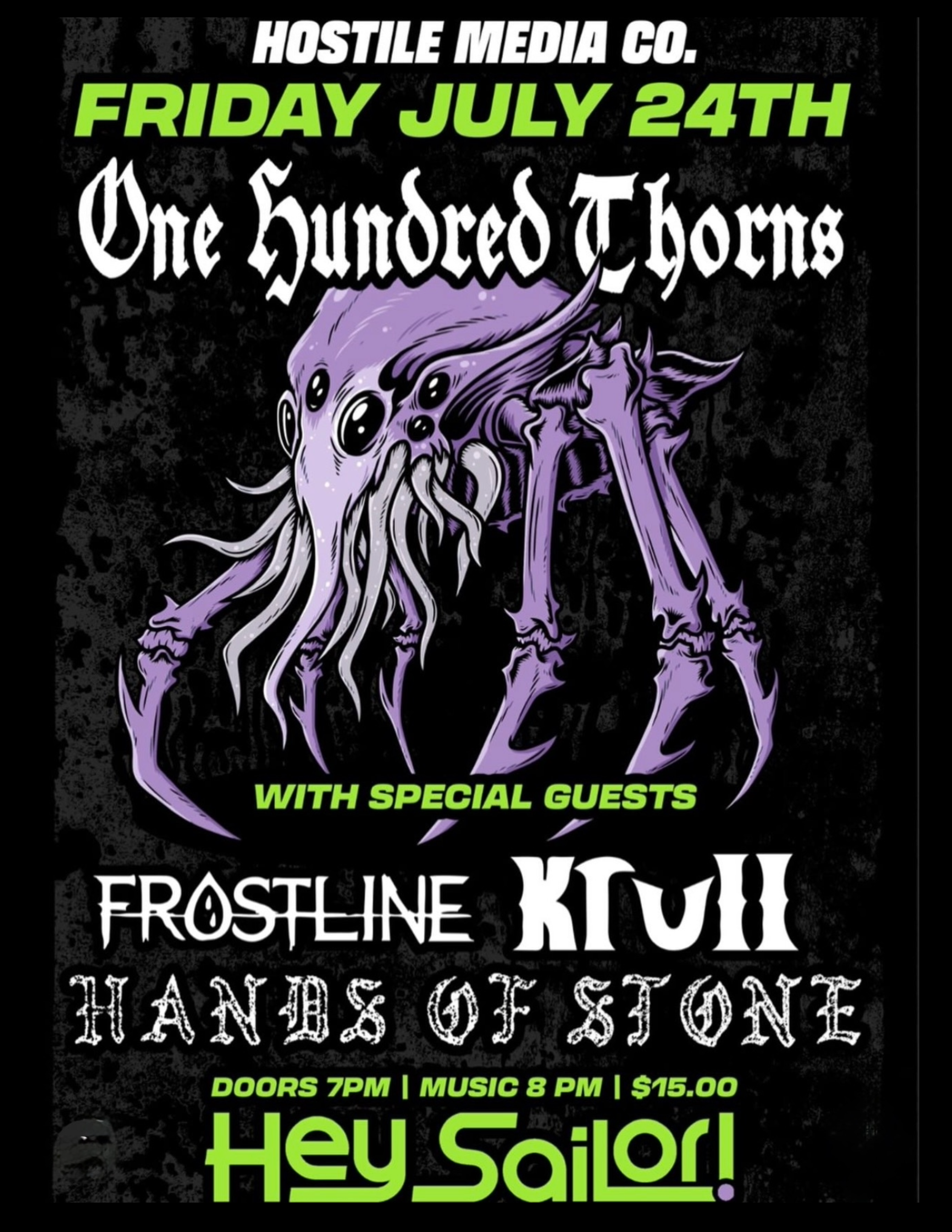 100 Thorns wsg Frostline, Krull, Hands of Stone Friday, July 24, 2026 7:00 PM 10:00 PM Hey Sailor! 27 East Main Street Searsport, ME, 04974 United States (map) Google Calendar ICS