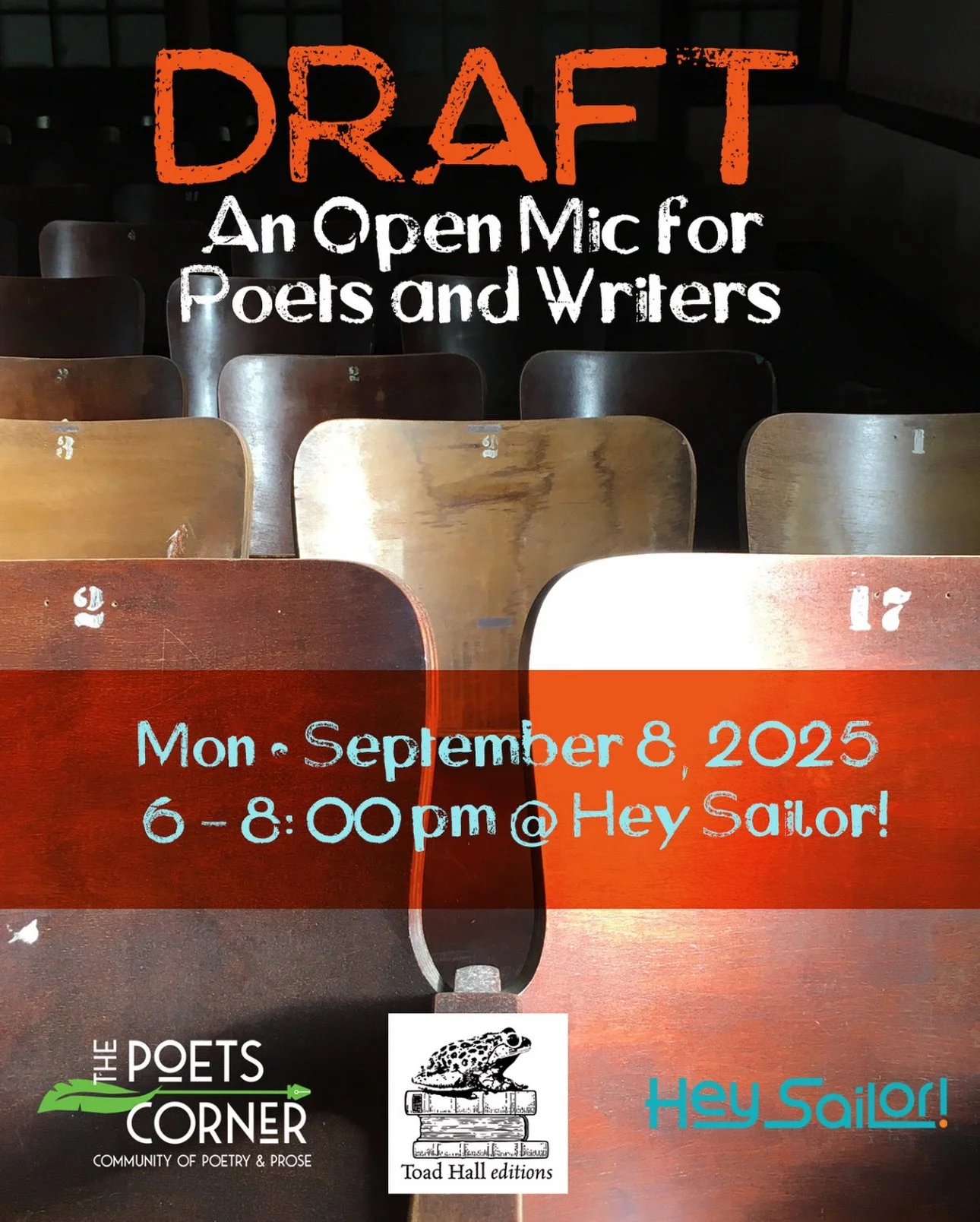 DRAFT: An Open Mic for Poets and Writers Monday, September 8, 2025 6:00 PM 8:00 PM Hey Sailor! 25 East Main Street Searsport, ME, 04974 United States (map) Google Calendar ICS