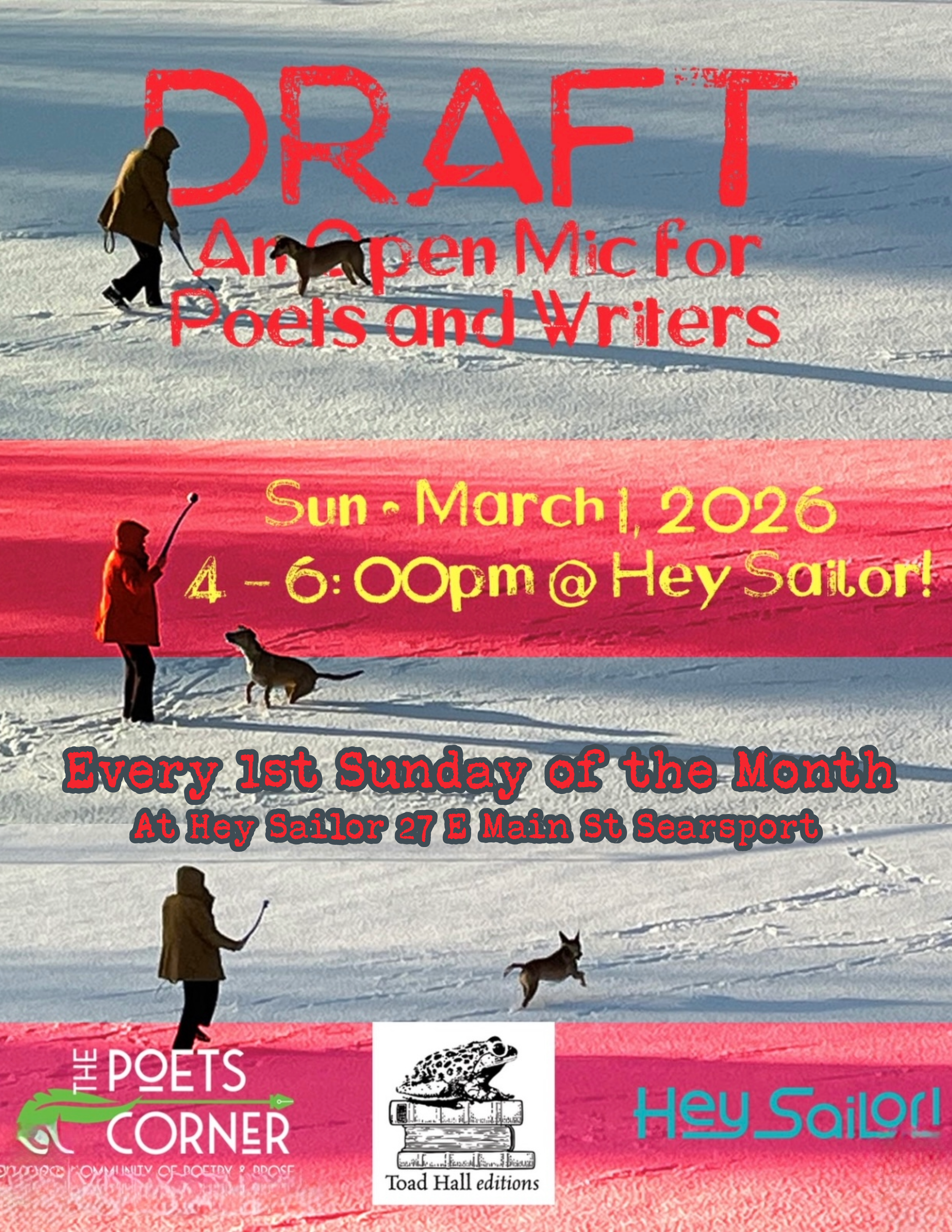Back to All Events DRAFT: An Open Mic for Poets and Writers Sunday, March 1, 2026 4:00 PM 6:00 PM Hey Sailor! 25 East Main Street Searsport, ME, 04974 United States (map) Google Calendar ICS