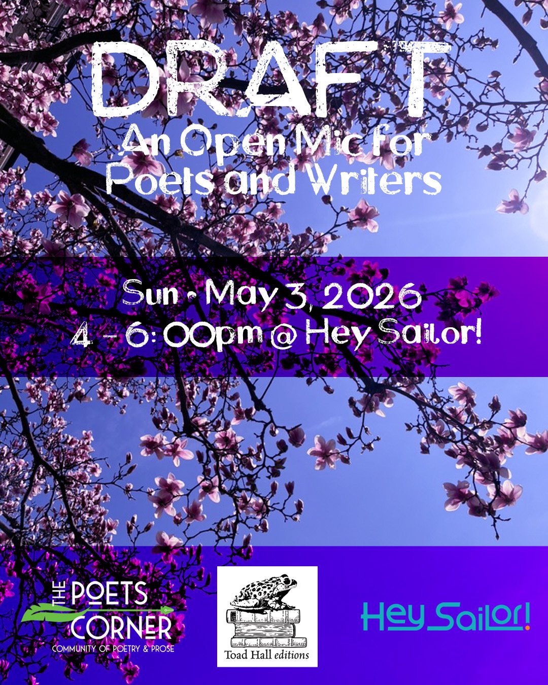 DRAFT : An Open Mic for Poets and Writers Sunday, May 3, 2026 4:00 PM 6:00 PM Hey Sailor! 27 East Main Street Searsport, ME, 04974 United States (map) Google Calendar ICS