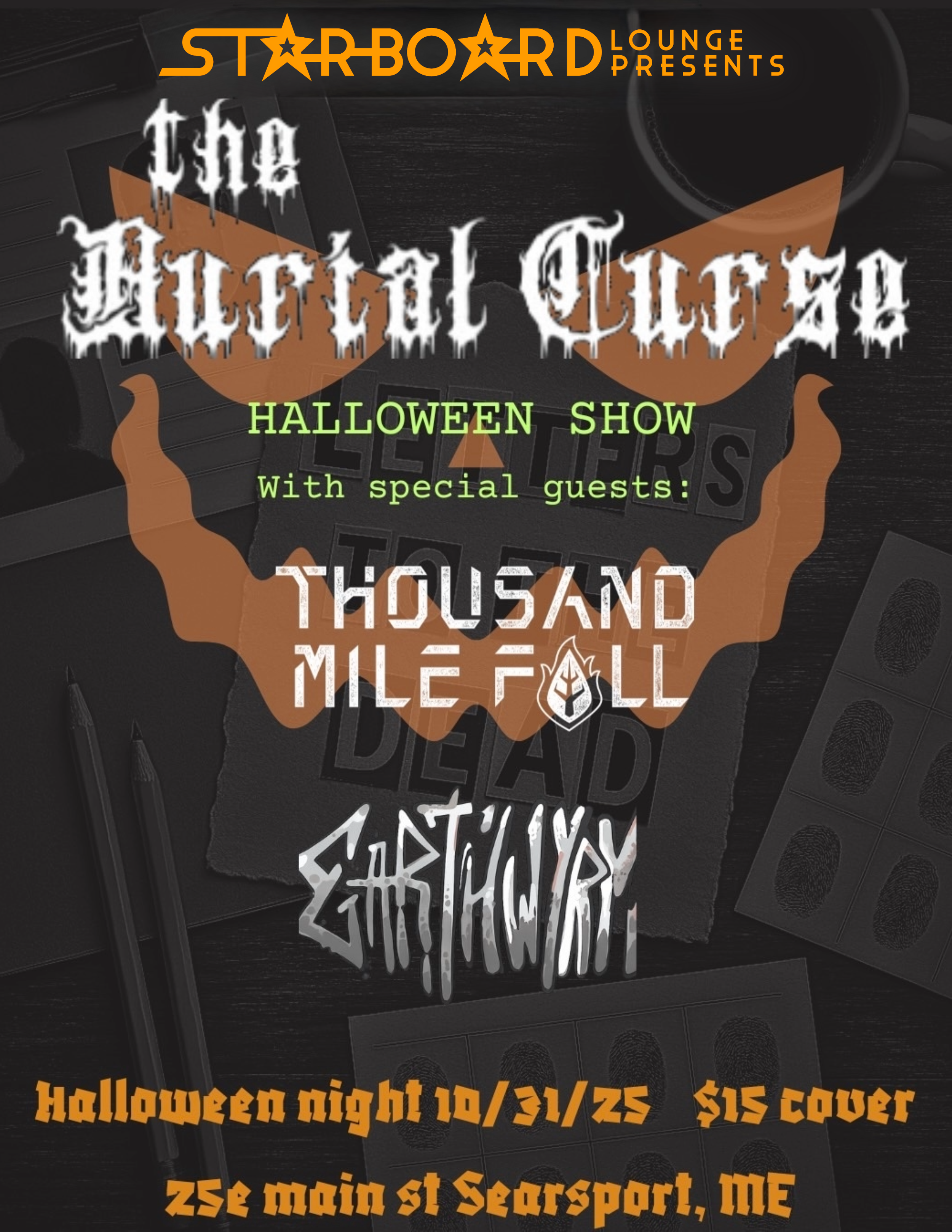 HALLOWEEN METAL with THE BURIAL CURSE - THOUSAND MILE FALL - EARTHWYRM Friday, October 31, 2025 7:00 PM 10:00 PM Hey Sailor! 27 East Main Street Searsport, ME, 04974 United States (map) Google Calendar ICS