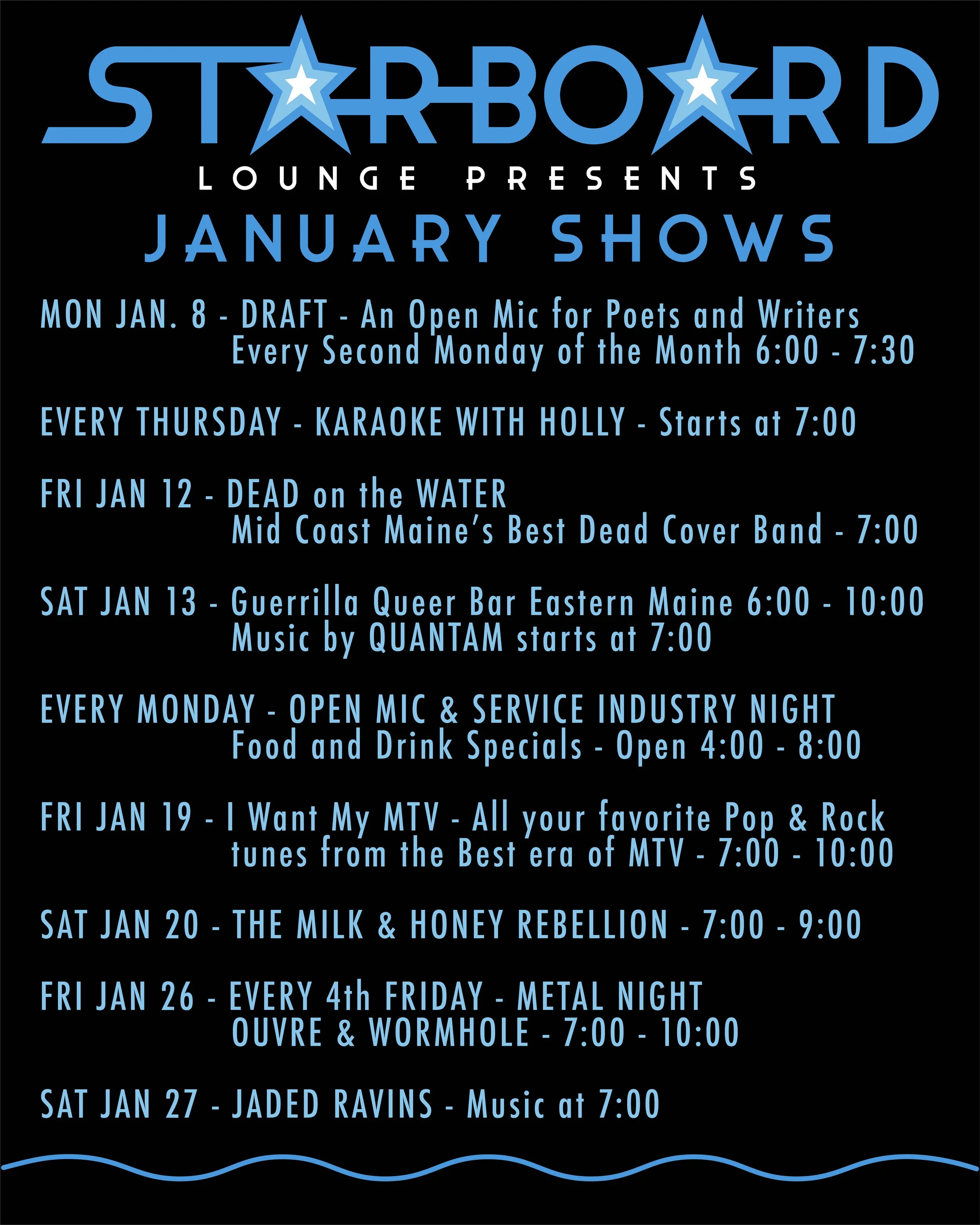 JANUARY SHOWS Monday, January 1, 2024 6:30 PM Wednesday, January 31, 2024 7:30 PM Hey Sailor! 25 East Main Street Searsport, ME, 04974 United States (map) Google Calendar ICS