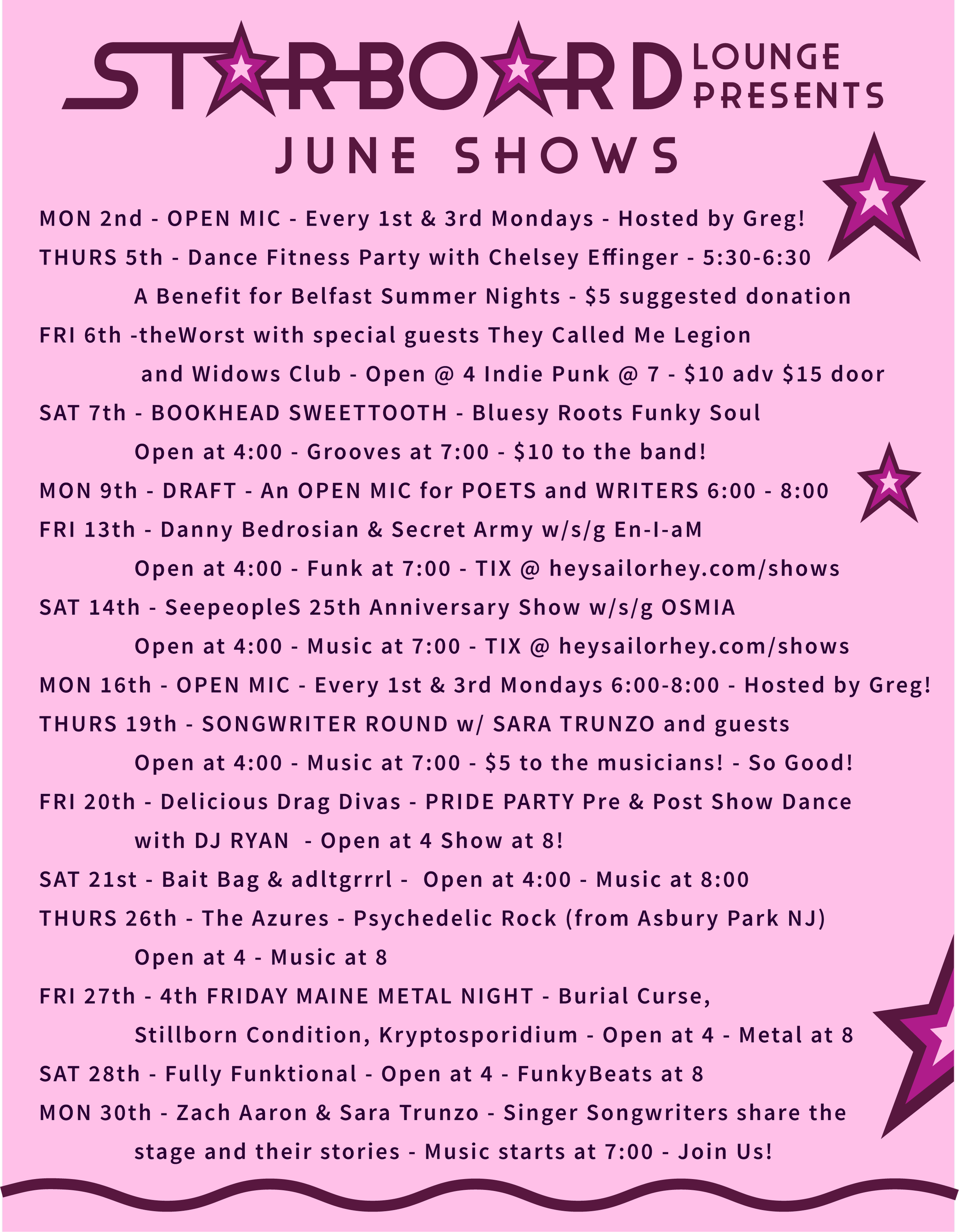 JUNE SHOWS Sunday, June 1, 2025 4:00 PM Monday, June 30, 2025 9:00 PM Hey Sailor! 25 East Main Street Searsport, ME, 04974 United States (map) Google Calendar ICS