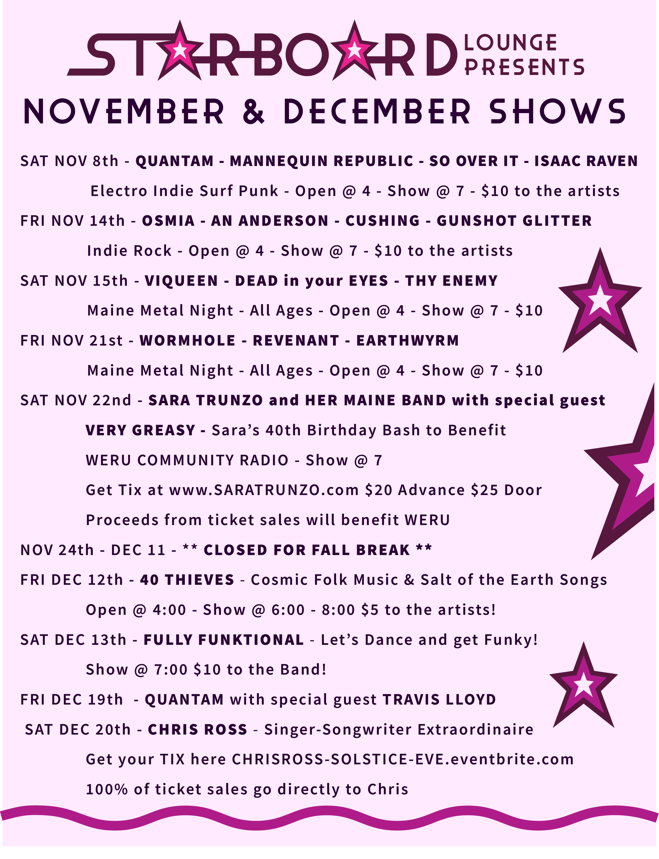 November and December Shows Friday, November 7, 2025 7:00 PM Saturday, December 20, 2025 8:00 PM Hey Sailor! 27 East Main Street Searsport, ME, 04974 United States (map) Google Calendar ICS