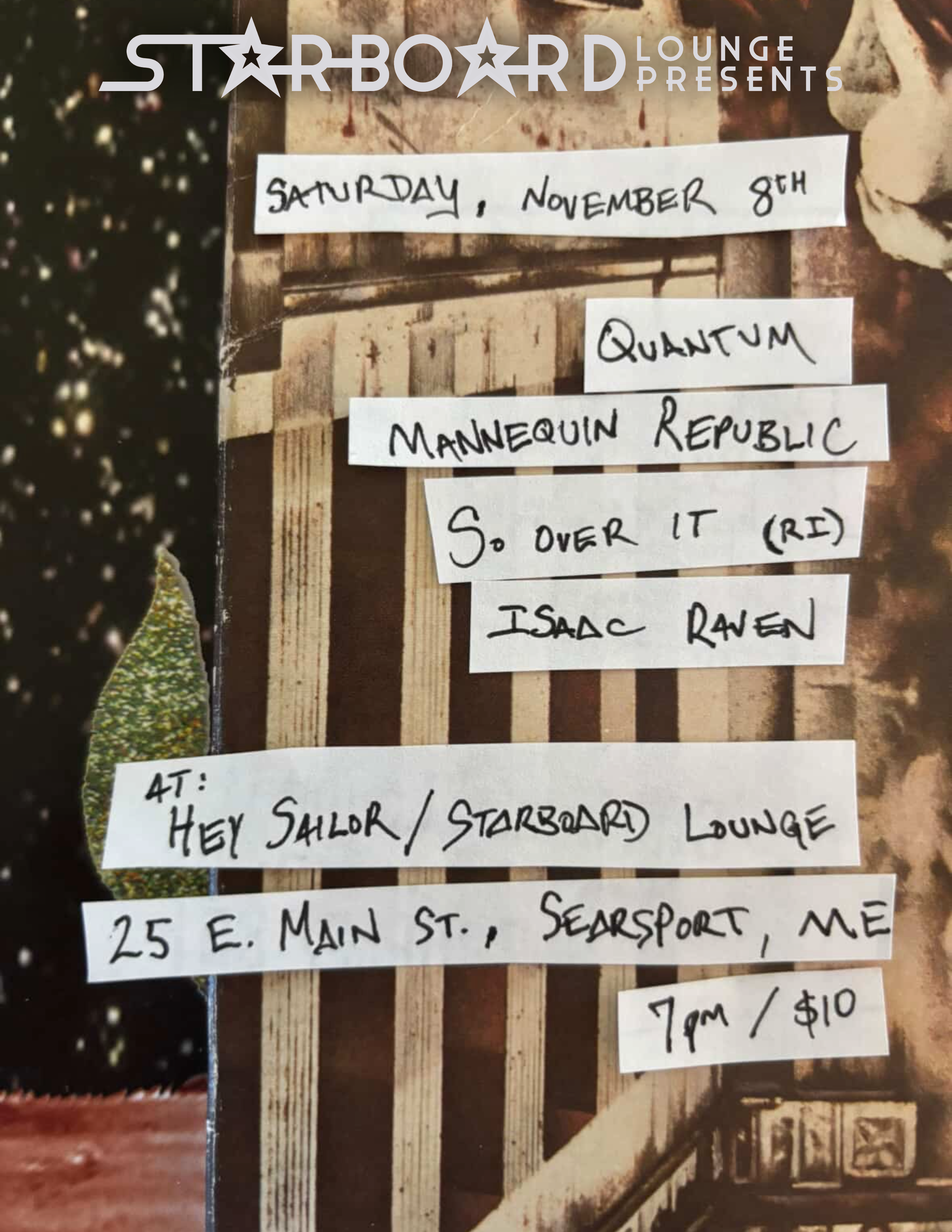 QUANTAM - MANNEQUIN REPUBLIC - SO OVER IT - ISAAC RAVEN Saturday, November 8, 2025 7:00 PM 10:00 PM Hey Sailor! 27 East Main Street Searsport, ME, 04974 United States (map) Google Calendar ICS So Over It - Instagram Mannequin Republic - Instagram Isaac Raven - Instagram