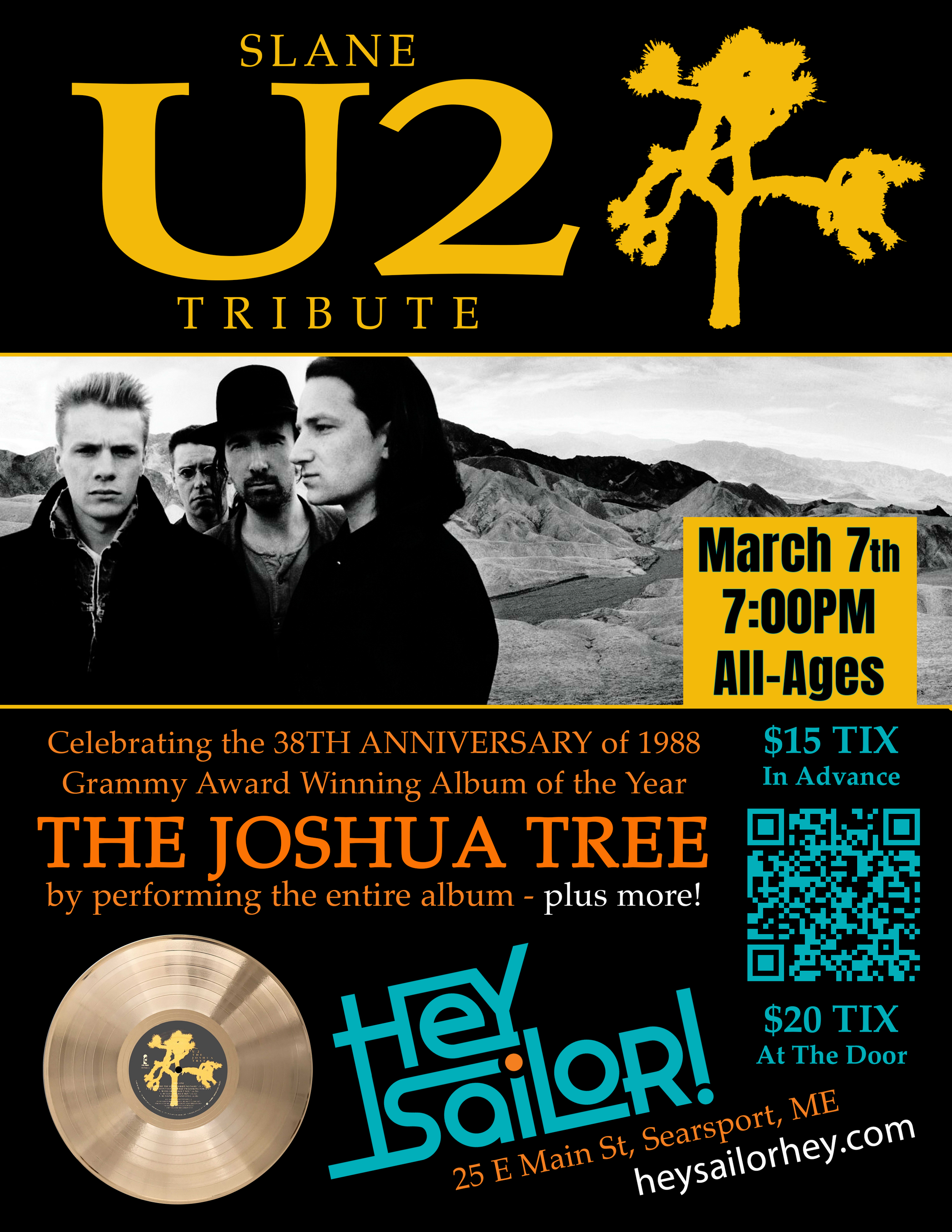 SLANE - U2 Tribute Band - Performing Joshua Tree Saturday, March 7, 2026 7:00 PM 9:00 PM Hey Sailor! 27 East Main Street Searsport, ME, 04974 United States (map) Google Calendar ICS GET TIX HERE SLANE MAINE