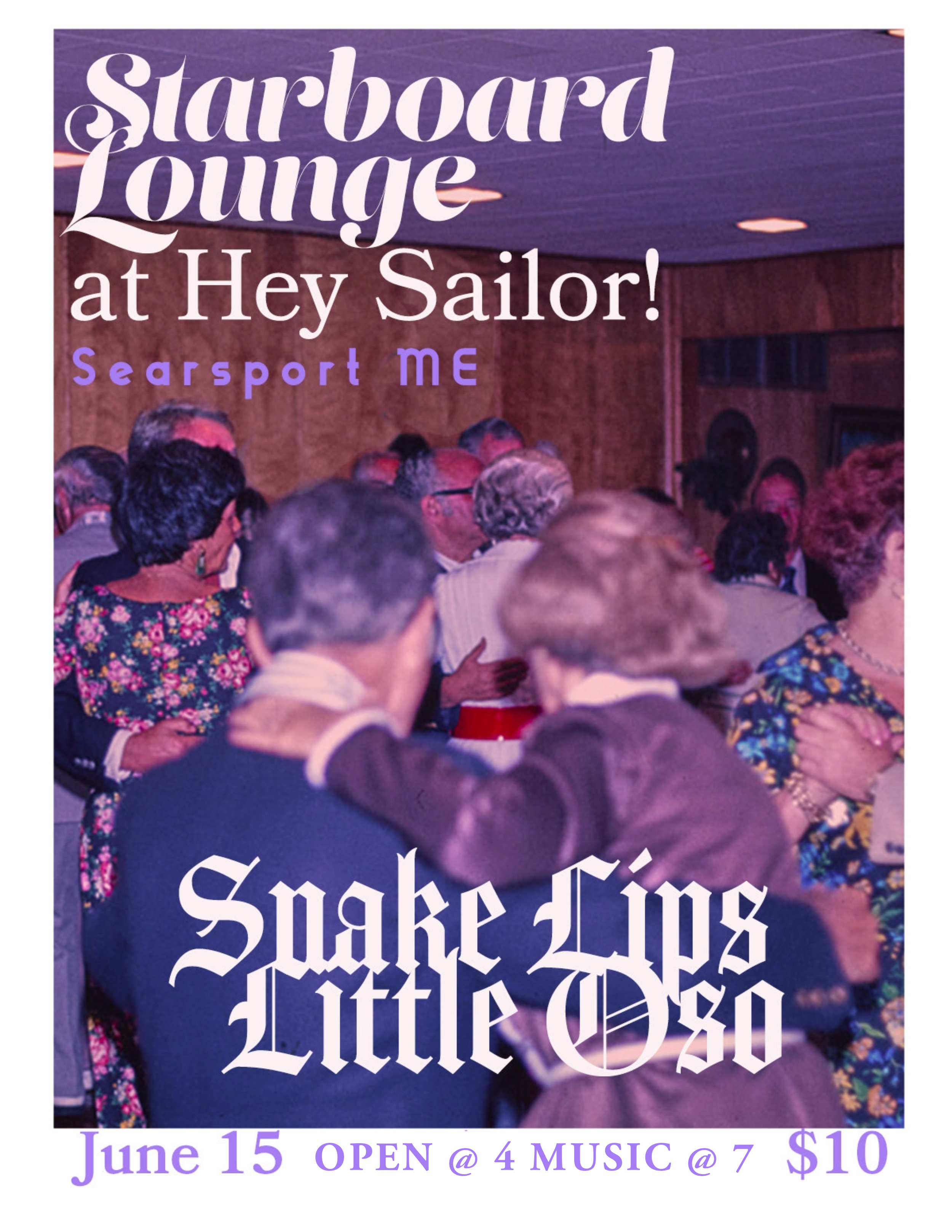 SNAKE LIPS and LITTLE OSO Sunday, June 15, 2025 7:00 PM 9:00 PM Hey Sailor! 25 East Main Street Searsport, ME, 04974 United States (map) Google Calendar ICS SNAKE LIPS IG LITTLE OSO IG