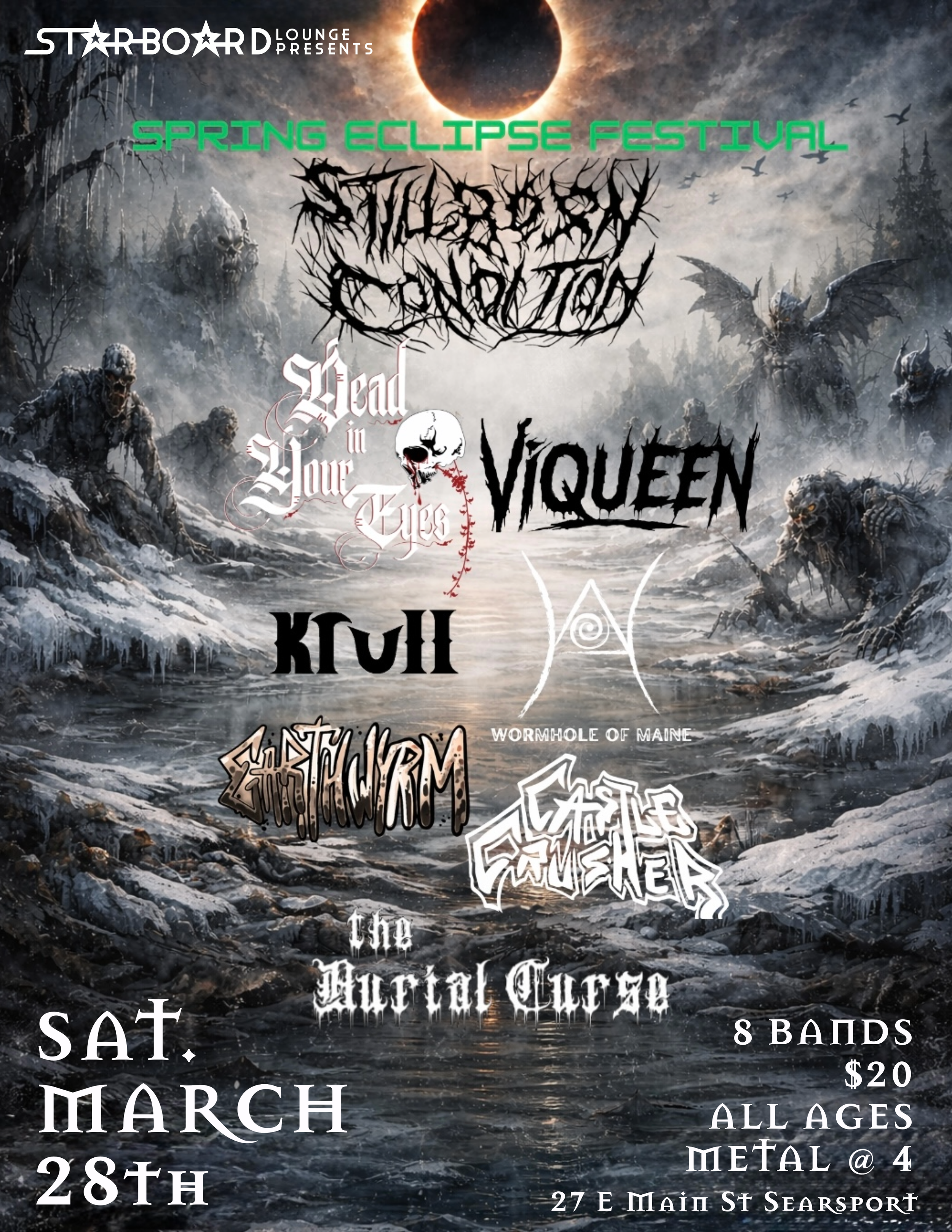Back to All Events SPRING ECLIPSE METAL FESTIVAL Saturday, March 28, 2026 4:00 PM 10:00 PM Hey Sailor! 27 East Main Street Searsport, ME, 04974 United States (map) Google Calendar ICS Stillborn Condition IG Dead in your Eyes IG VIQUEEN IG KRULL IG WORMHOLE IG Castle Crusher FB EARTHWYRM the Burial Curse