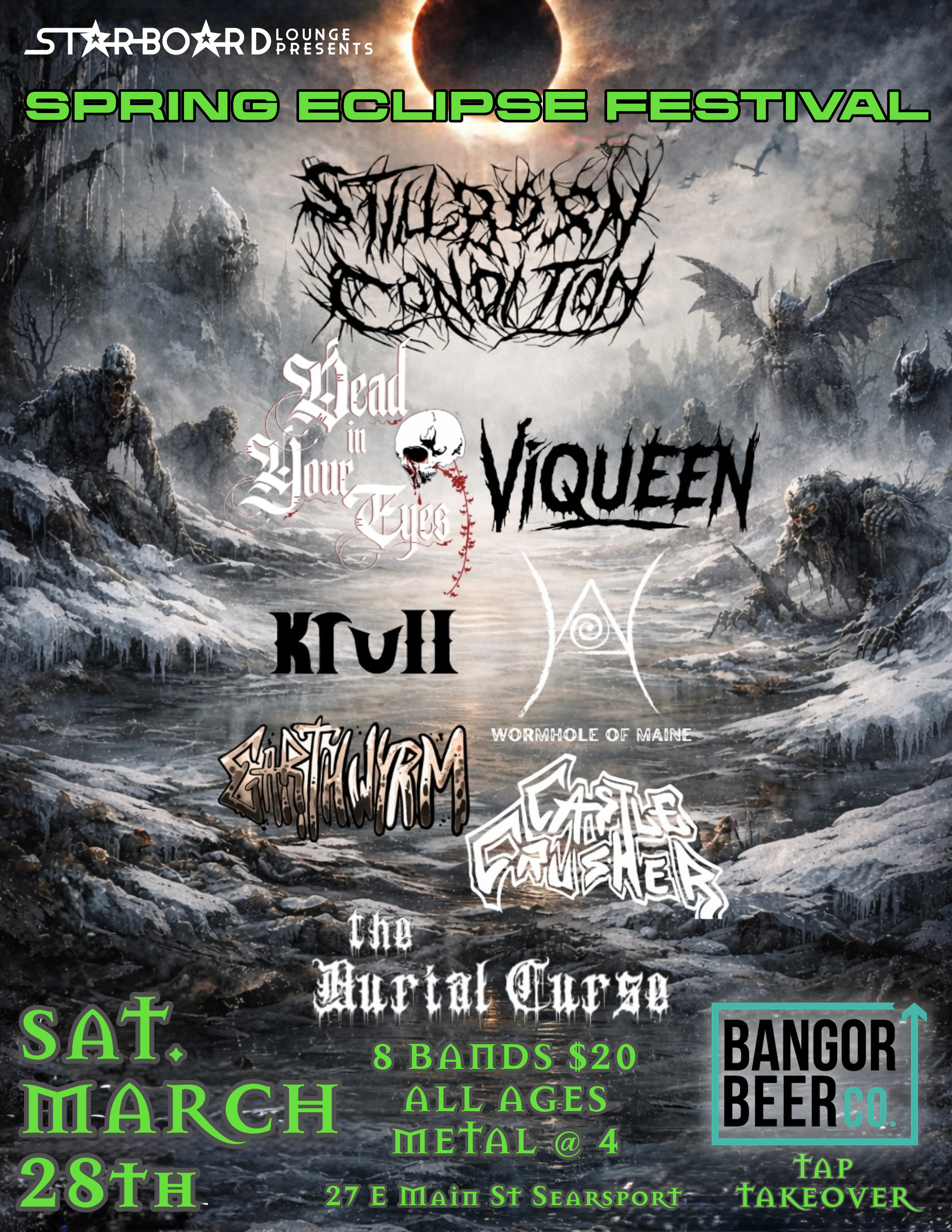 SPRING ECLIPSE METAL FESTIVAL Saturday, March 28, 2026 4:00 PM 10:00 PM Hey Sailor! 27 East Main Street Searsport, ME, 04974 United States (map) Google Calendar ICS Stillborn Condition IG Dead in your Eyes IG VIQUEEN IG KRULL IG WORMHOLE IG Castle Crusher FB EARTHWYRM the Burial Curse