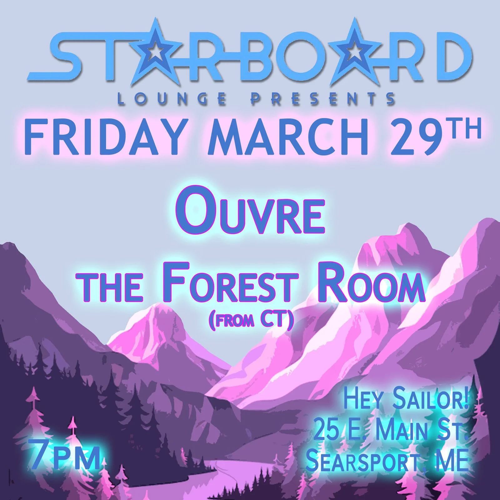 THE FOREST ROOM & OUVRE Friday, March 29, 2024 7:00 PM 10:00 PM Hey Sailor! 25 East Main Street Searsport, ME, 04974 United States (map) Google Calendar ICS