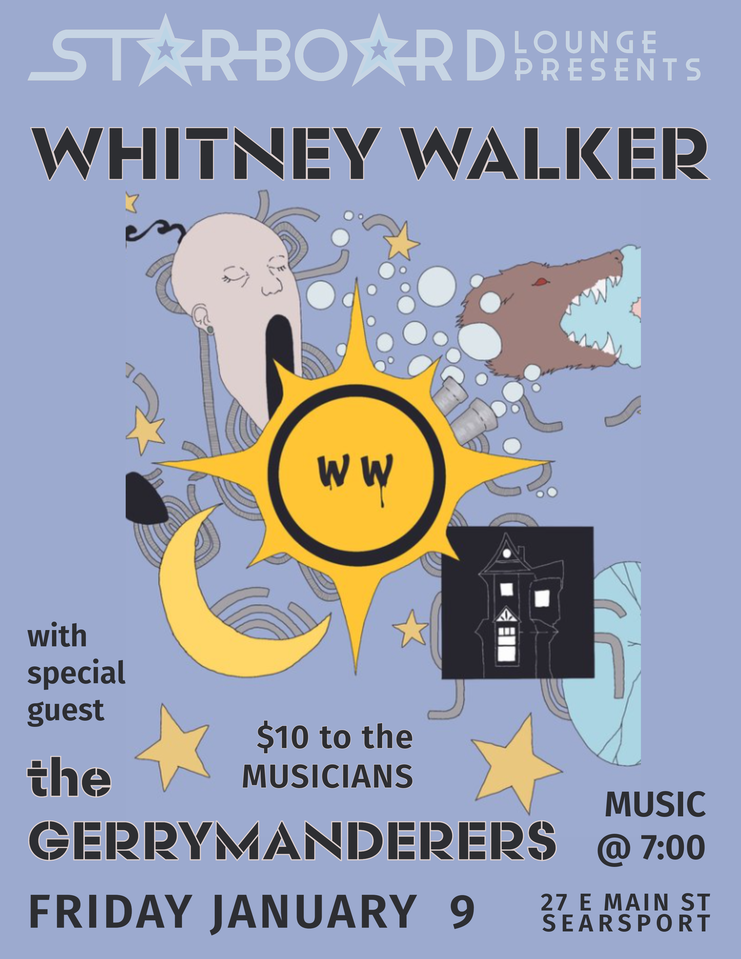 WHITNEY WALKER w-s-g THE GERRYMANDERERS Friday, January 9, 2026 7:00 PM 9:00 PM Hey Sailor! 27 East Main Street Searsport, ME, 04974 United States (map) Google Calendar ICS